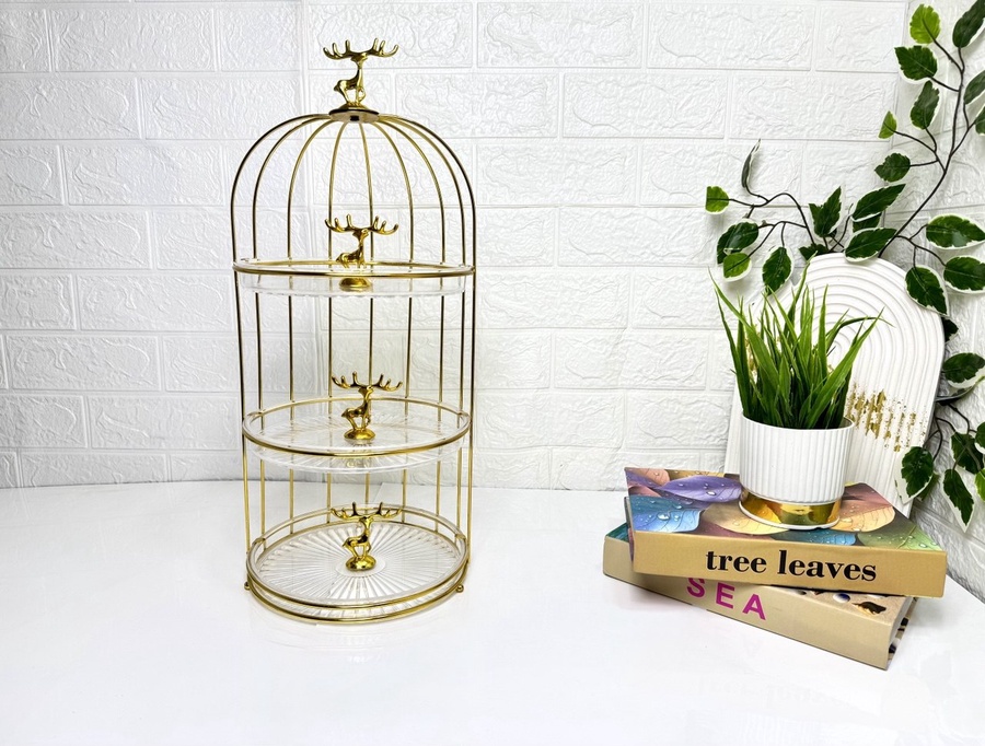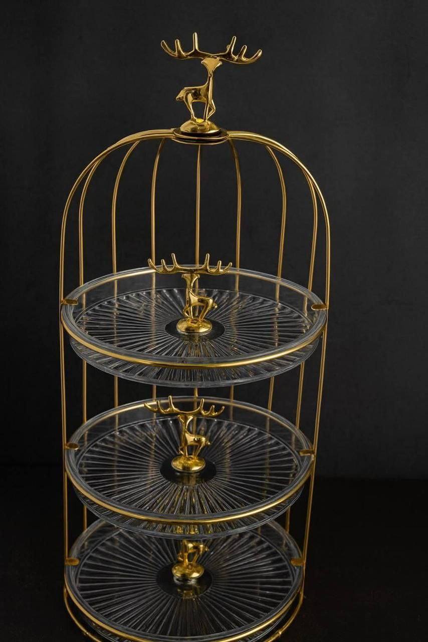 مصنوعة من معدن قوي مع أطباق أكريليك شفافة تعطي مظهرًا عصريًا وفخمًا في نفس الوقت، بينما يضيف رأس الغزالة الذهبية لمسة ديكور فريدة تجعلها قطعة لافتة للنظر على أي طاولة.